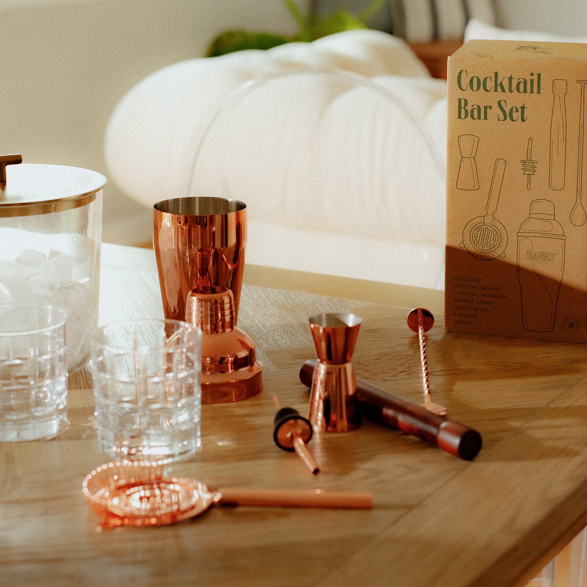 Cocktail Shaker . Cocktail Muddler Double Jigger . Spoon Mixer Strainer . Pourer Materials . Stainless Steel & Sanded / Naturally Stained Timber