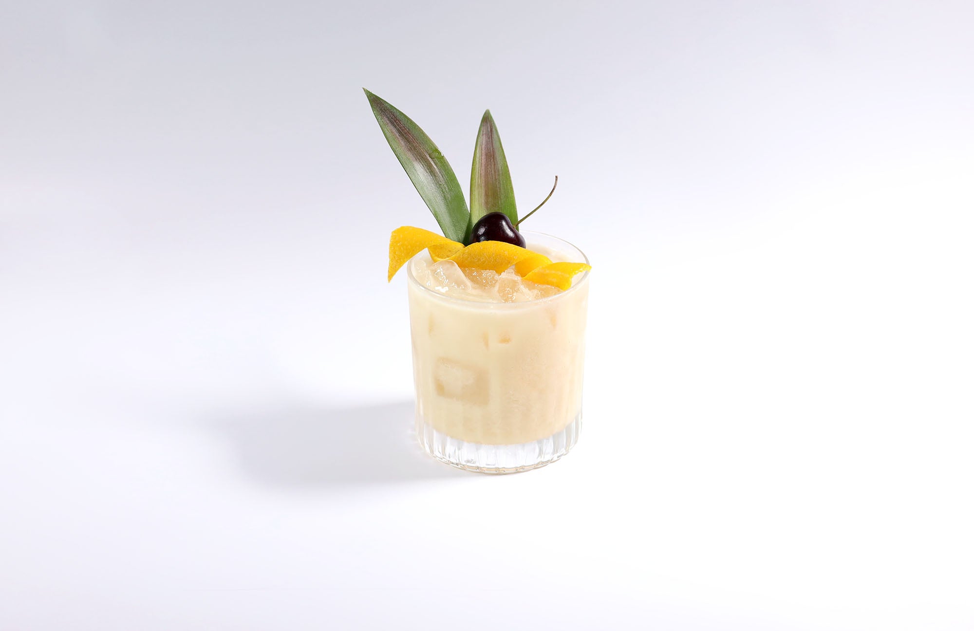 Add all ingredients to shaker, strain over large ice and garnish with pineapple leaves and cherry or mint.
