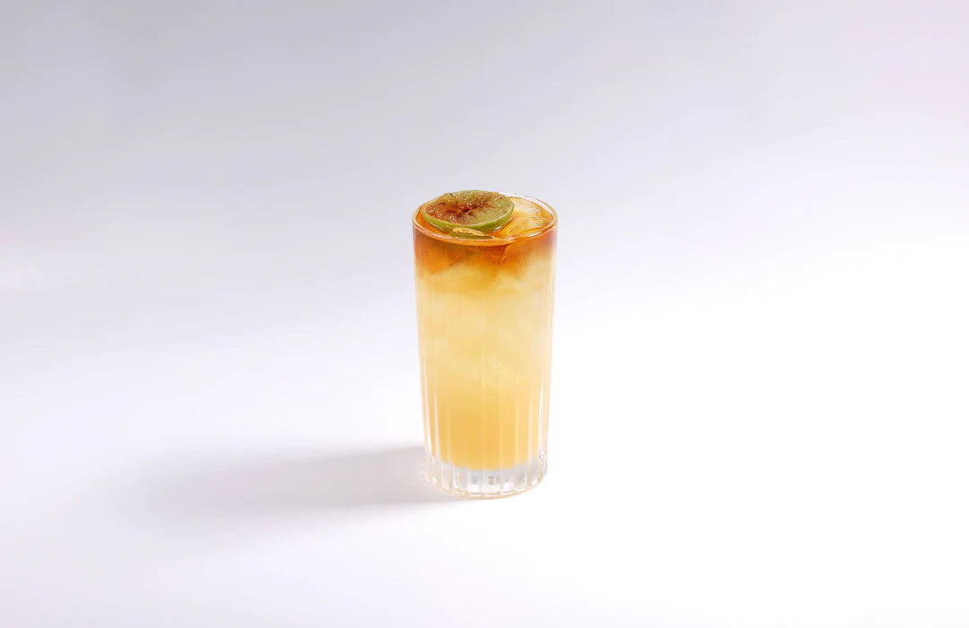 Build all ingredient in highball, float rum on top, garnish lime half and flame.