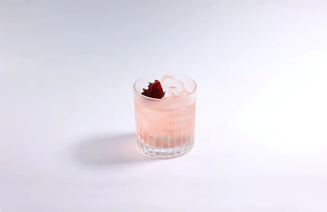 Pour 90ml into a stirring glass and stir for 20 seconds. Strain over a large ice cube in a double old fashioned. Garnish with Hibiscus flower.